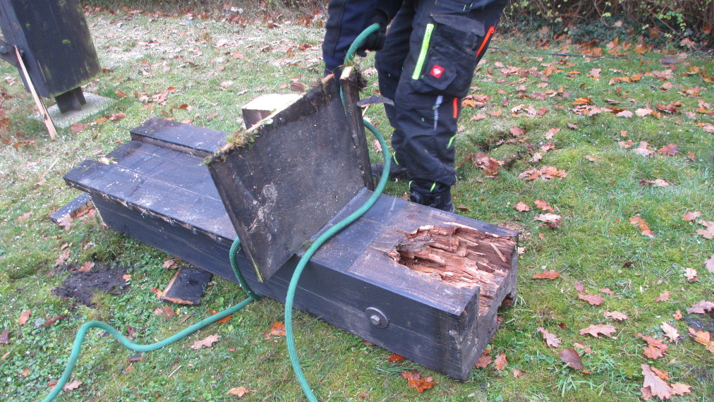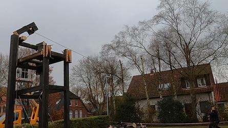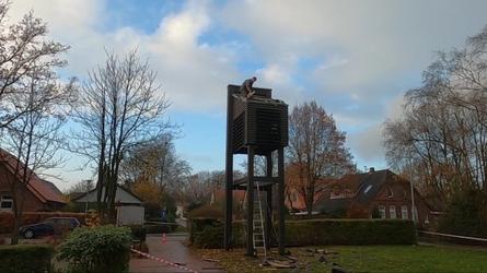 Am 25. November 2021 kommt die Firma Otto-Buer aus Neustadt zum Lukas-Haus nach Tweelbäke, um die Glocke auszubauen. Als sie vor 20 Jahren die Glocke einbauten, gab es noch kein Dach im Glockenturm. Jetzt fehlen Platz und Haken, um die Glocke mit menschlicher Kraft herabzulassen. Ein Kran muss her - und das Dach muss weg. Die Glocke wiegt 480 kg - da muss die Aufhängung gut vorbereitet werden. Als Helfer in der Not erweist sich die Firma Jens Wiechmann aus der Nachbarschaft. Aus enger Verbundenheit zur Kirchengemeinde spendet sie den spontanen Kraneinsatz. Herzlichen Dank!